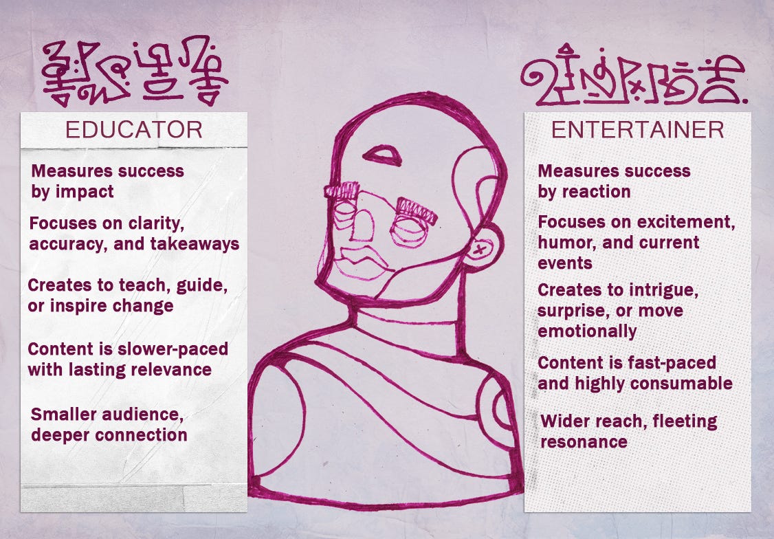 Entertainers create to move people emotionally in the moment. Their content is fast-paced more consumable. It reaches wider audiences but usually with short lived resonance. Their success comes from immediate gratification, so they focus on excitement, humor, and current events.